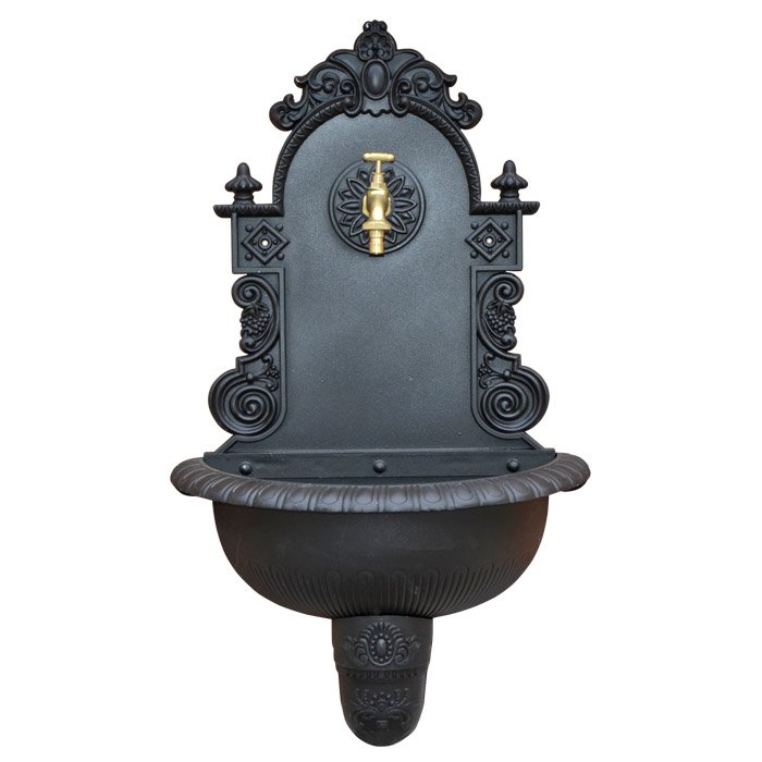 Fontana da parete realizzata in ghisa. Colore: antracite. Rubinetto incluso. Dimensioni: 76×42 cm.